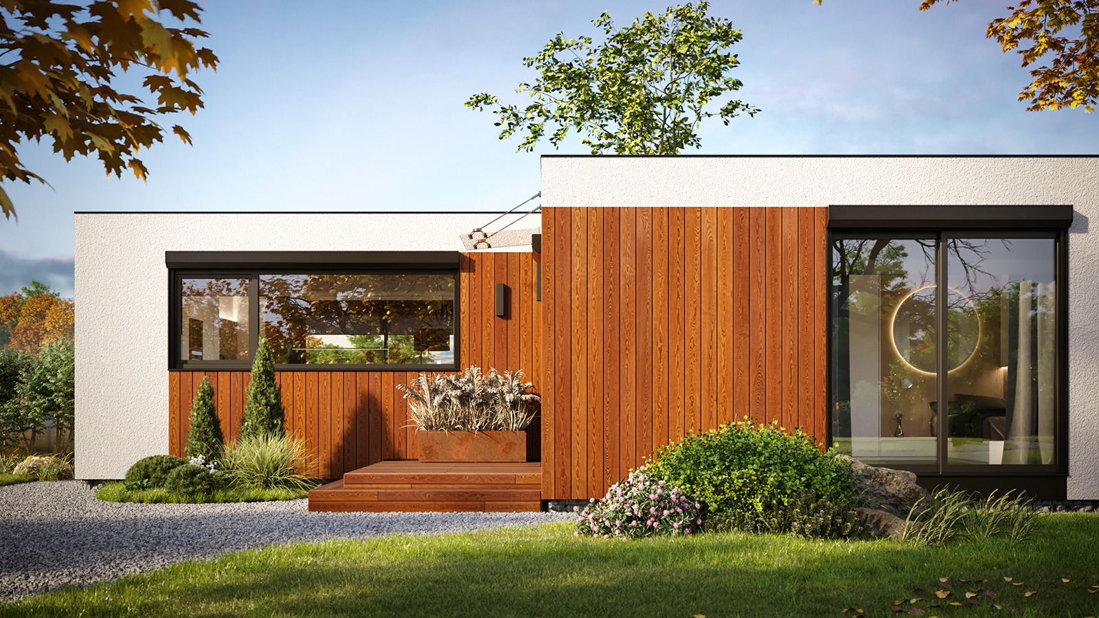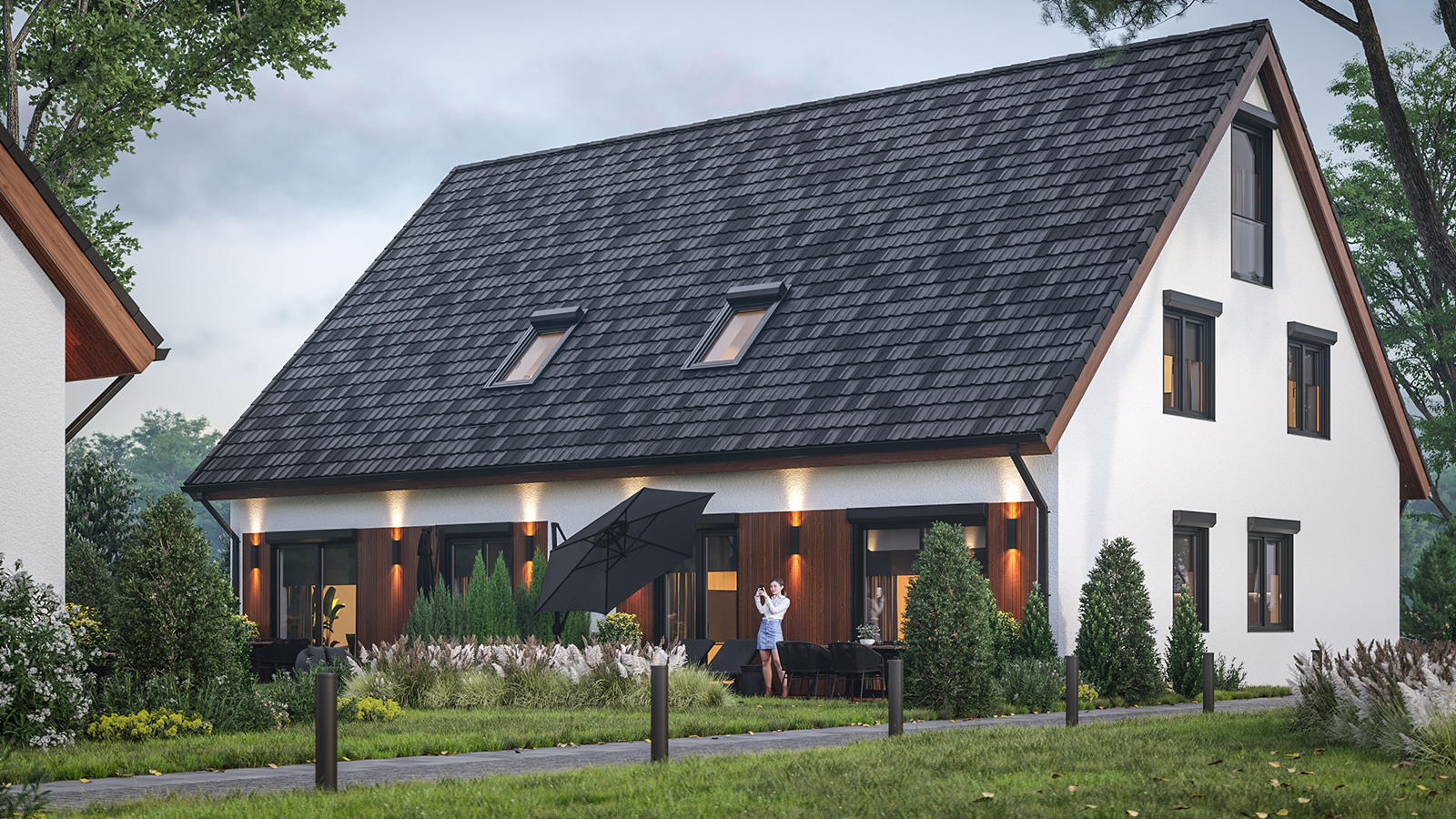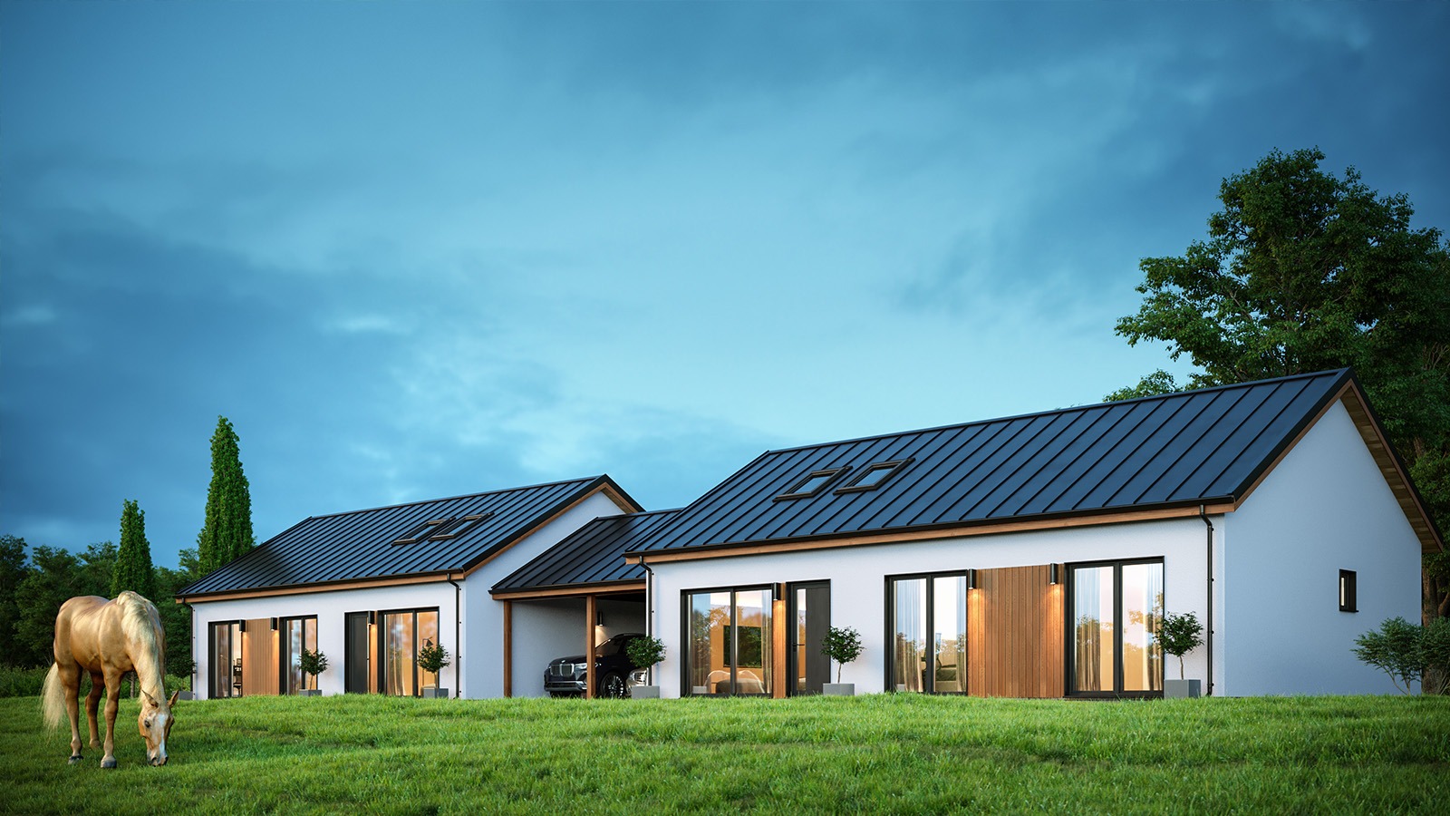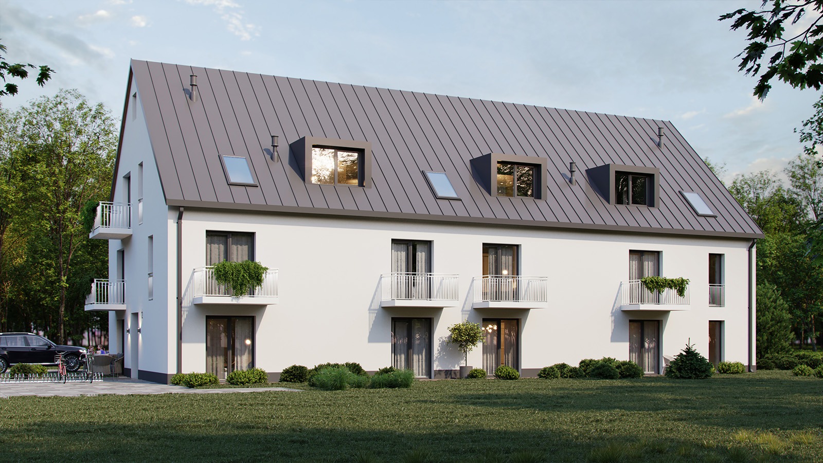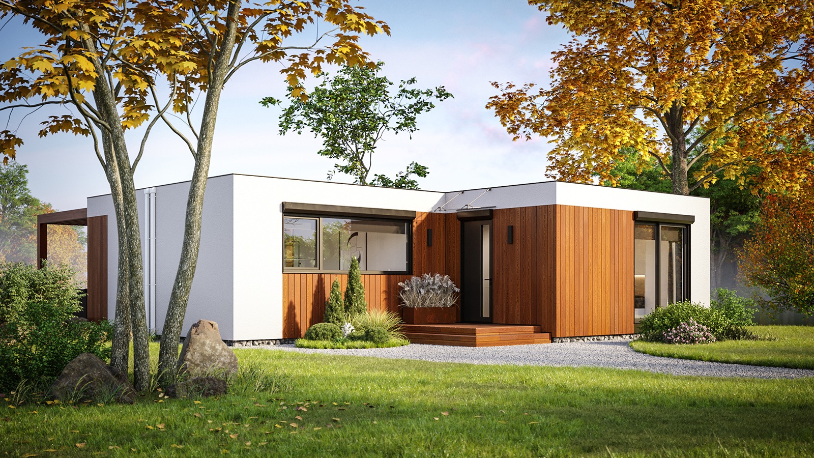 Eingeschossige und mehrgeschossige Gebäude unter Verwendung von Holzrahmen-Paneelen. Entsprechend dem KfW-Standard 40 Plus oder 55 mit QNG-Zertifizierung. Alle Vorteile des nachhaltigen Holzbaus. Planung, Produktion, Bau.