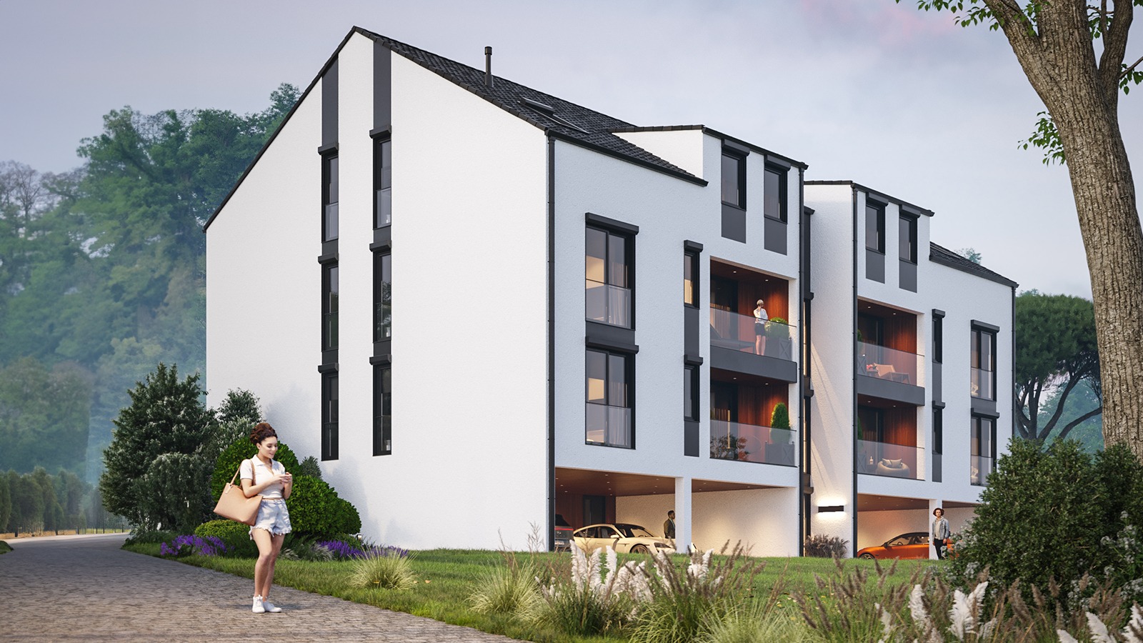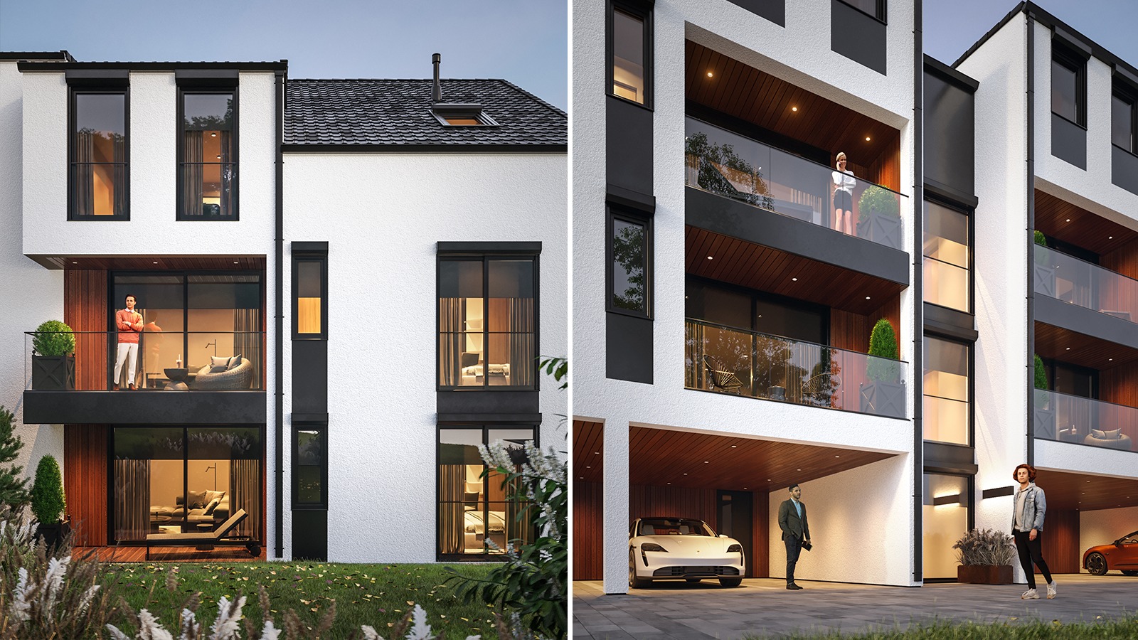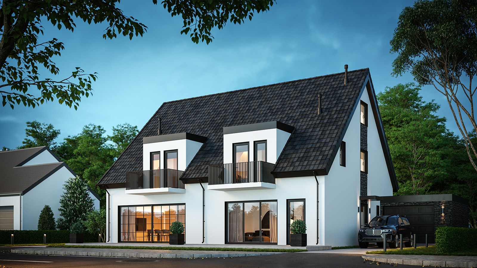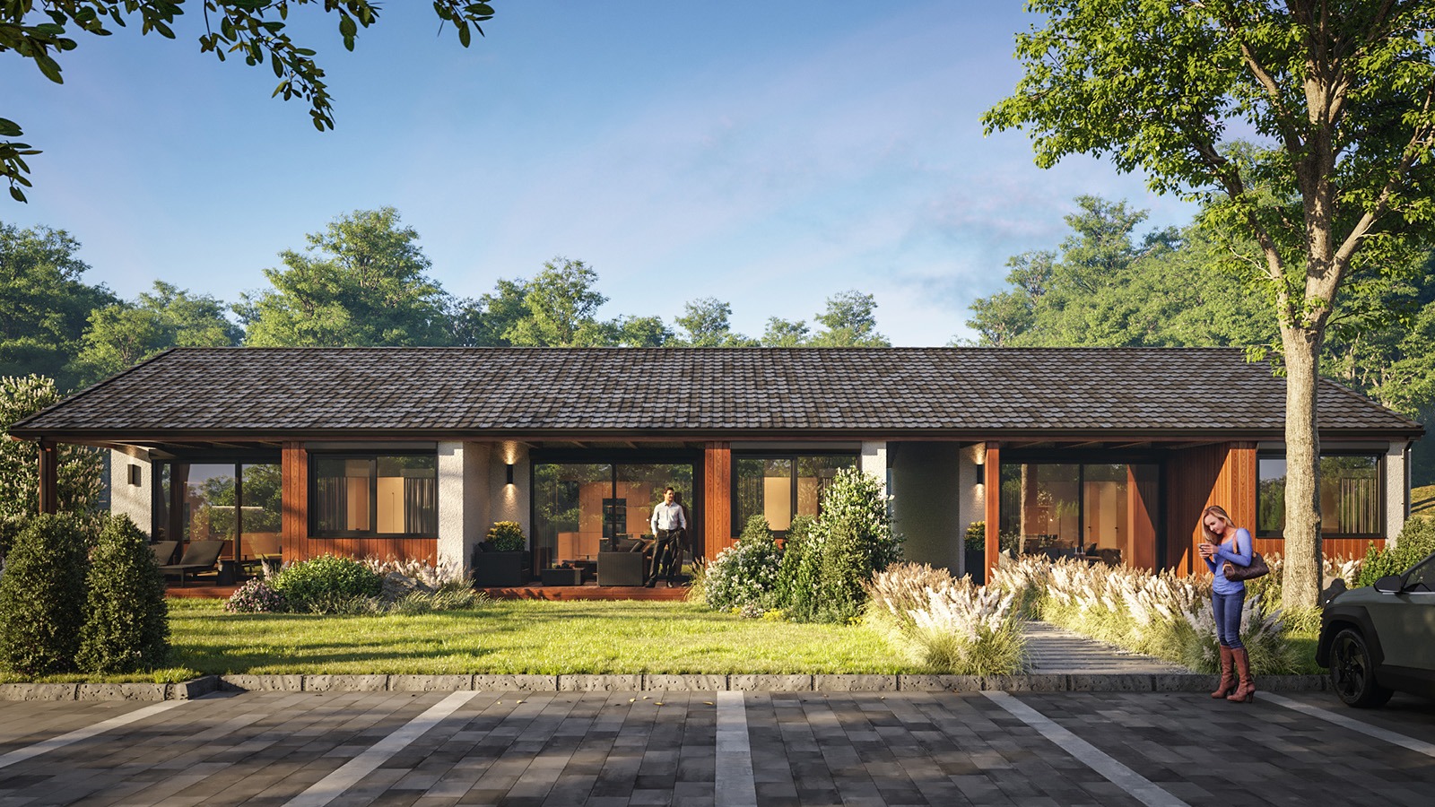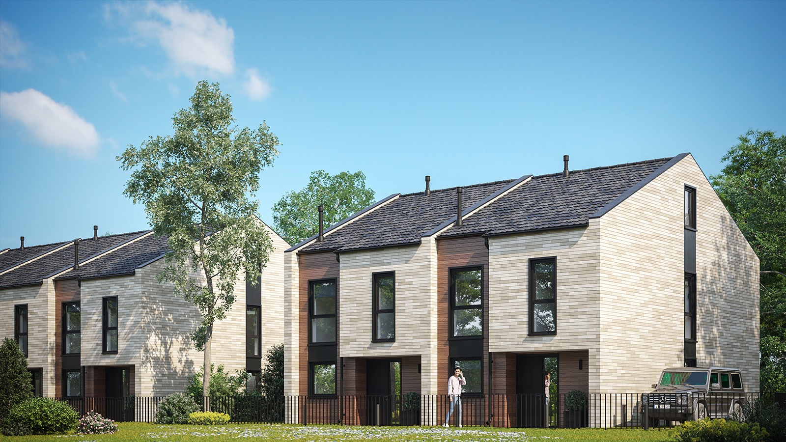 Eingeschossige und mehrgeschossige Gebäude unter Verwendung von Holzrahmen-Paneelen. Entsprechend dem KfW-Standard 40 Plus oder 55 mit QNG-Zertifizierung. Alle Vorteile des nachhaltigen Holzbaus. Planung, Produktion, Bau.